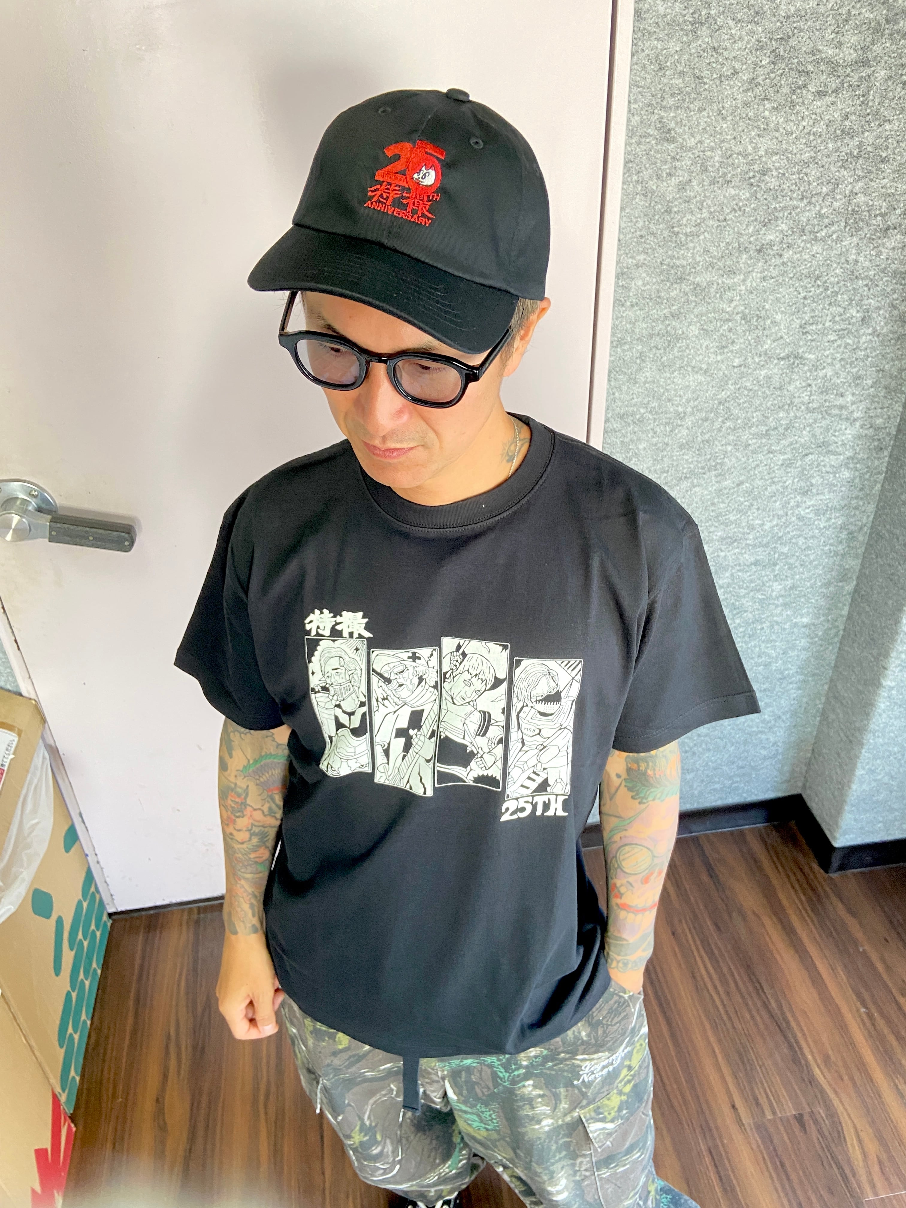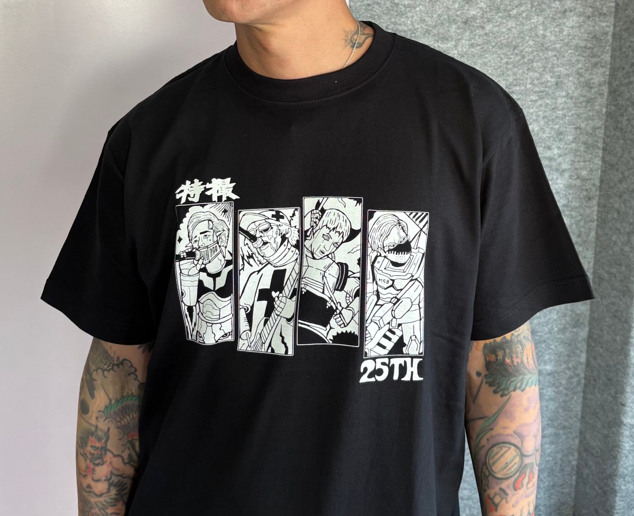 ロボット化したメンバーのイラストがプリントされた黒Tシャツです。